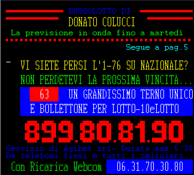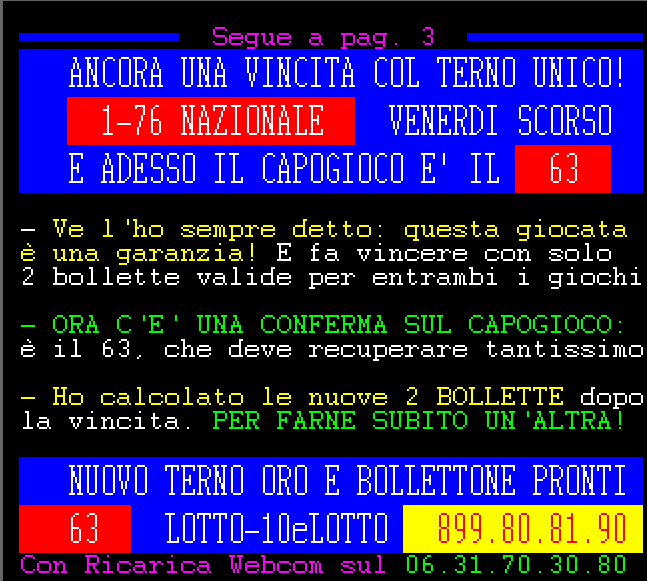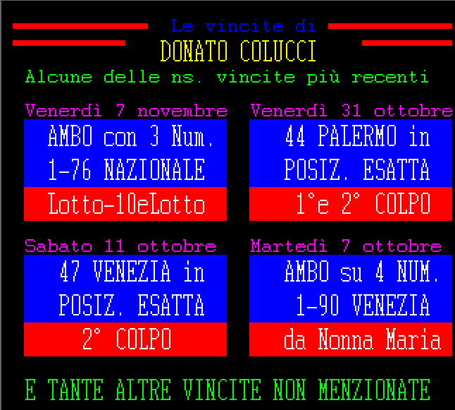Le informazioni del nostro servizio Audiotel sono elaborati su base statistica e non garantiscono in alcun caso la vincita certa. I nostri servizi raccomandano sempre un approccio al gioco responsabile, "ragionato", controllato e mai eccessivo. Si ricorda che tutti i giochi sono vietati ai minori di anni 18.