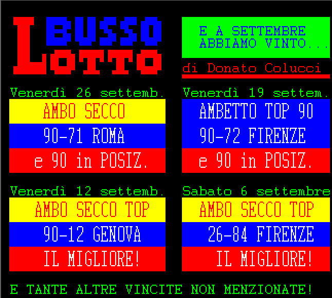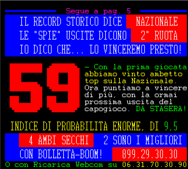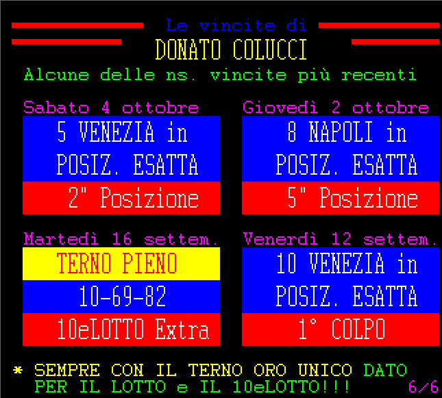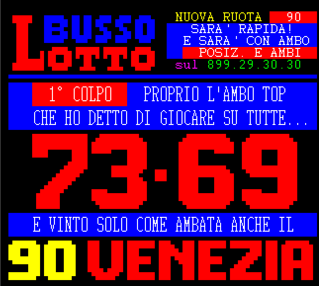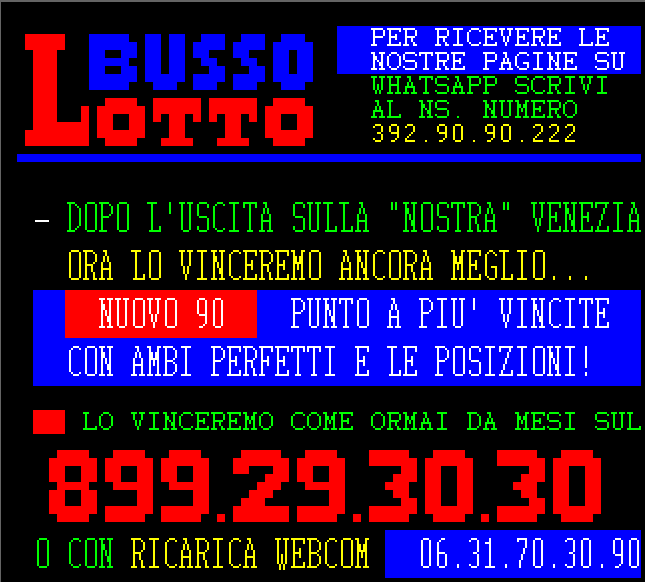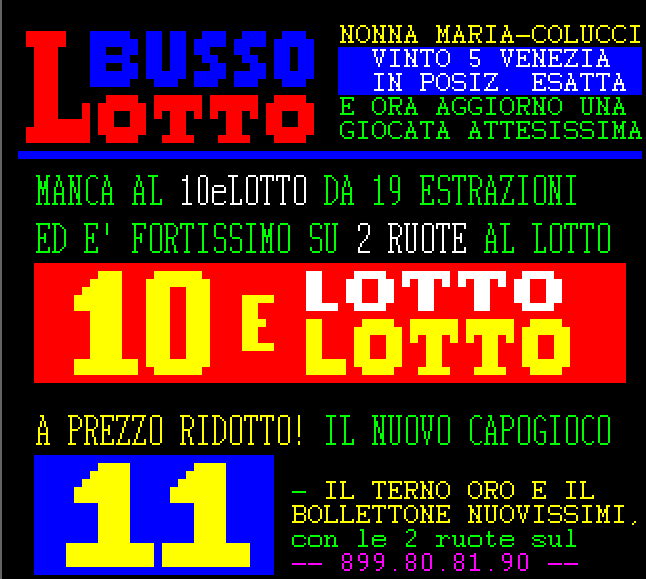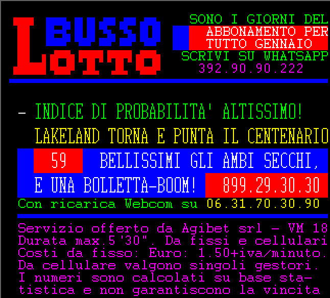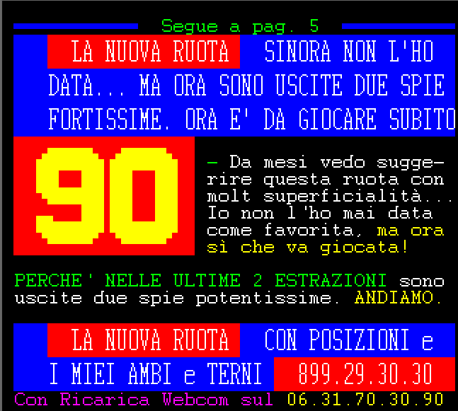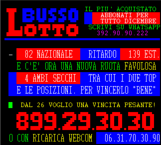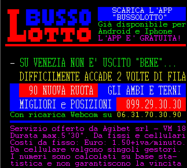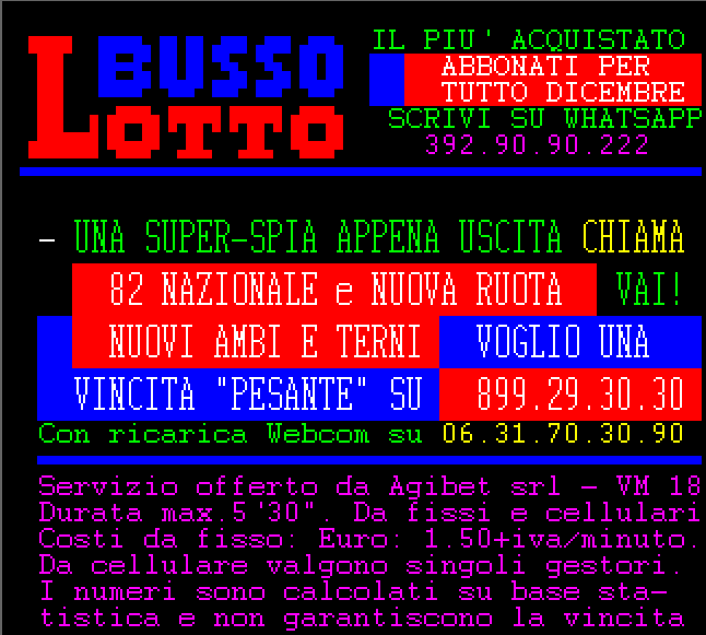 Le informazioni del nostro servizio Audiotel sono elaborati su base statistica e non garantiscono in alcun caso la vincita certa. I nostri servizi raccomandano sempre un approccio al gioco responsabile, "ragionato", controllato e mai eccessivo. Si ricorda che tutti i giochi sono vietati ai minori di anni 18.