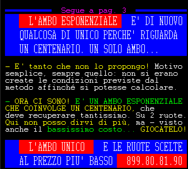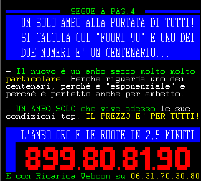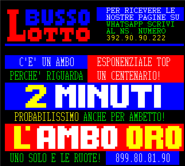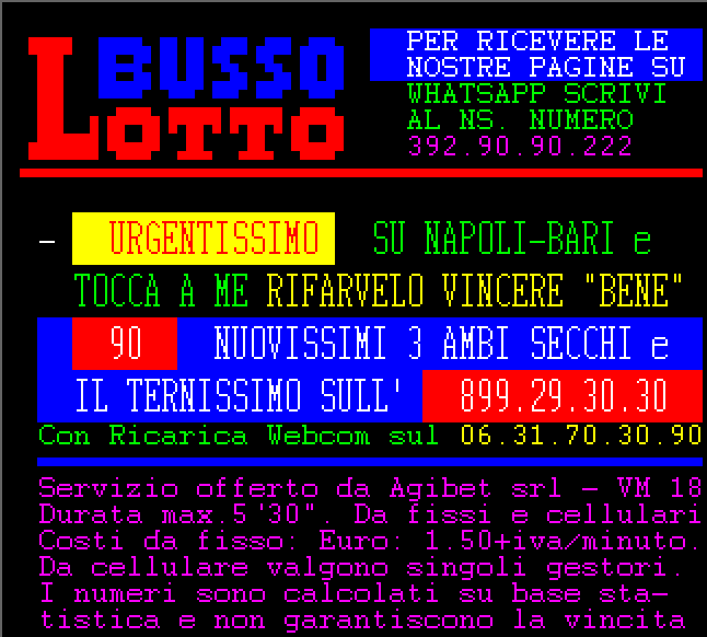 Le informazioni del nostro servizio Audiotel sono elaborati su base statistica e non garantiscono in alcun caso la vincita certa. I nostri servizi raccomandano sempre un approccio al gioco responsabile, "ragionato", controllato e mai eccessivo. Si ricorda che tutti i giochi sono vietati ai minori di anni 18.